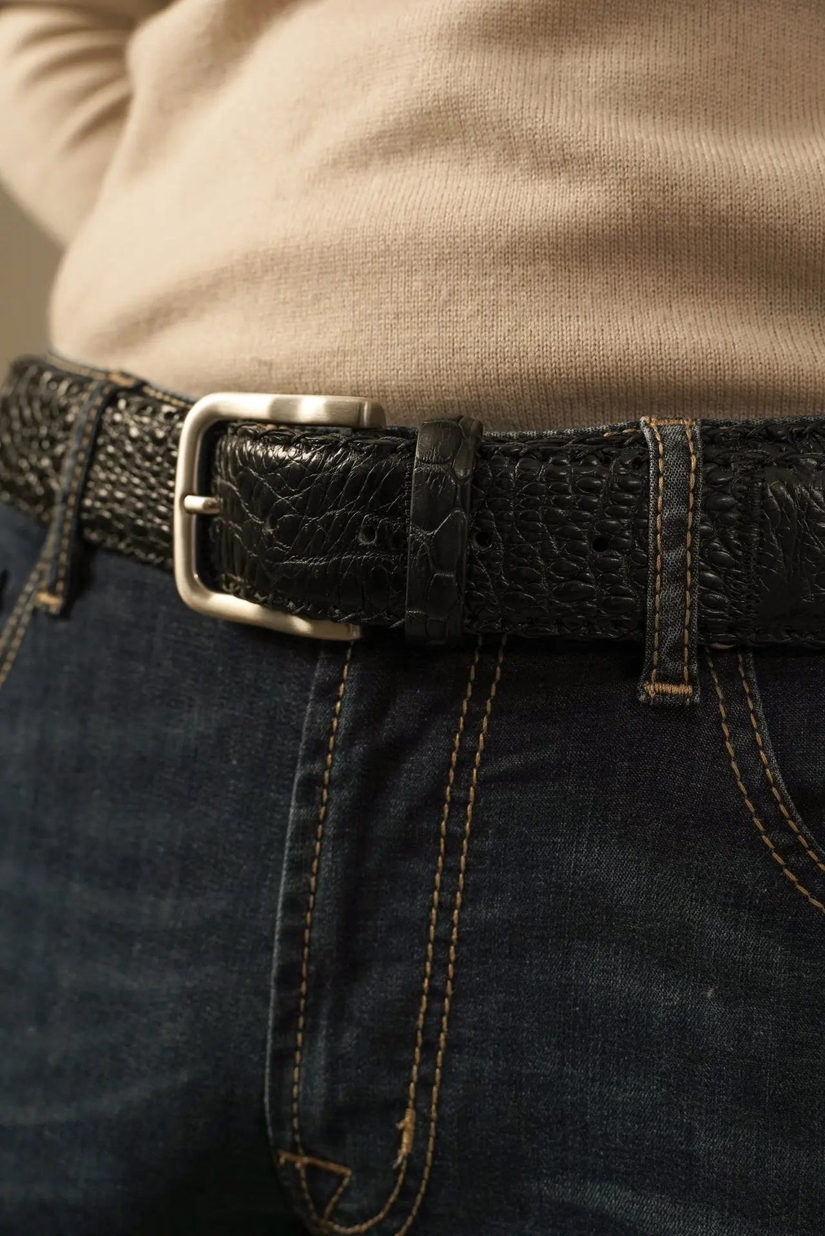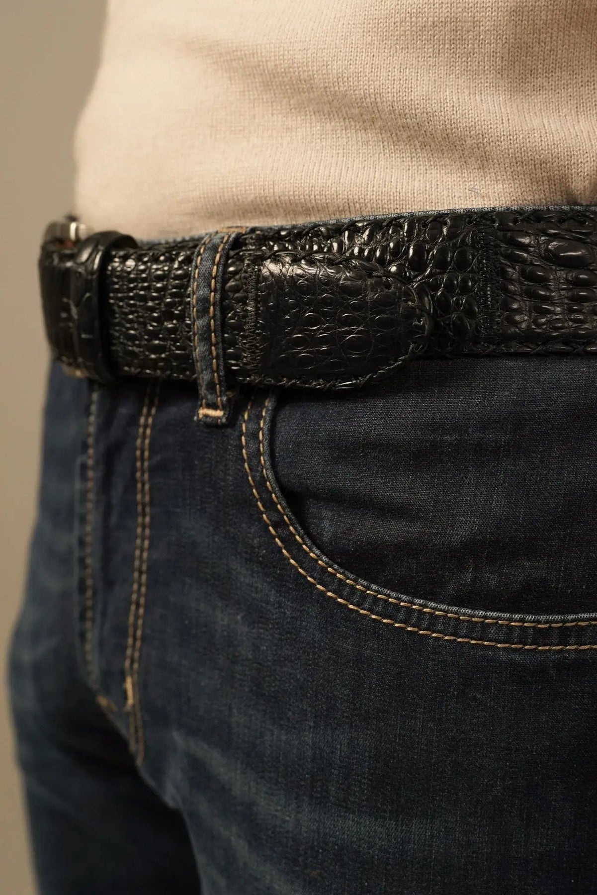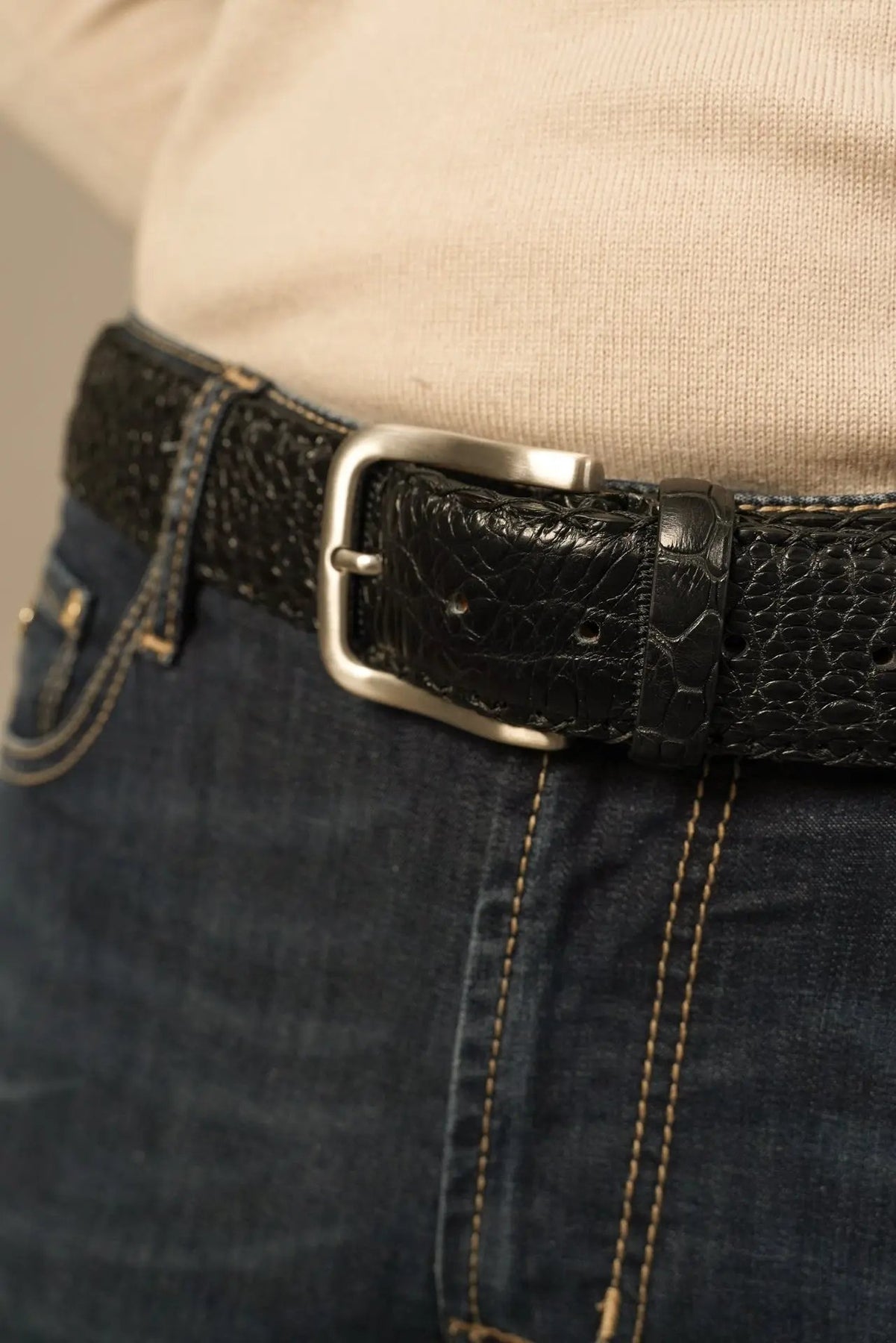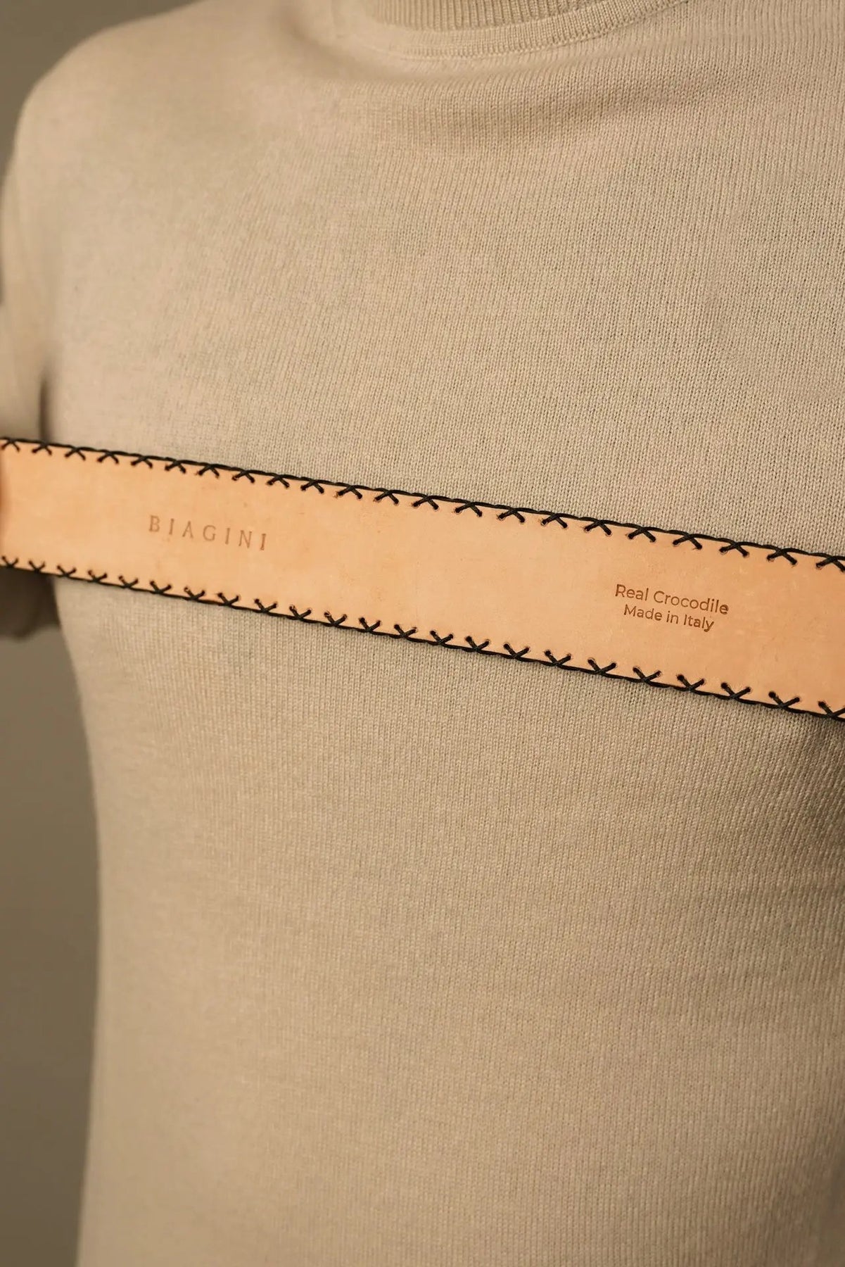 Dette eksklusive bælte fra Biagini er håndlavet i Italien af 100% ægte krokodilleskind og udstråler kompromisløs luksus og tidløs elegance. Den dybe sorte farve fremhæver den naturlige tekstur og unikke skælstruktur, hvilket giver bæltet et sofistikeret udtryk, der både passer til formelle lejligheder og eksklusiv hverdagsbrug.