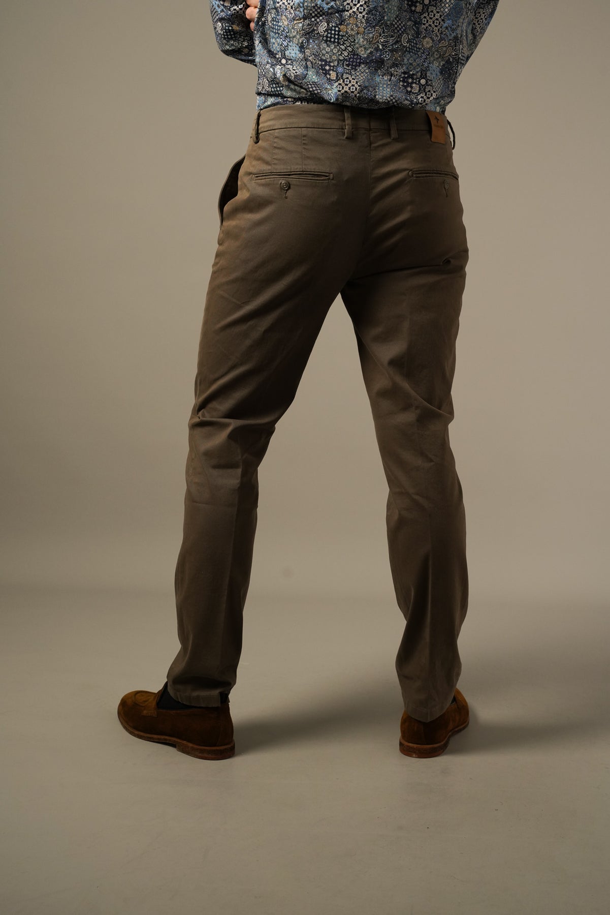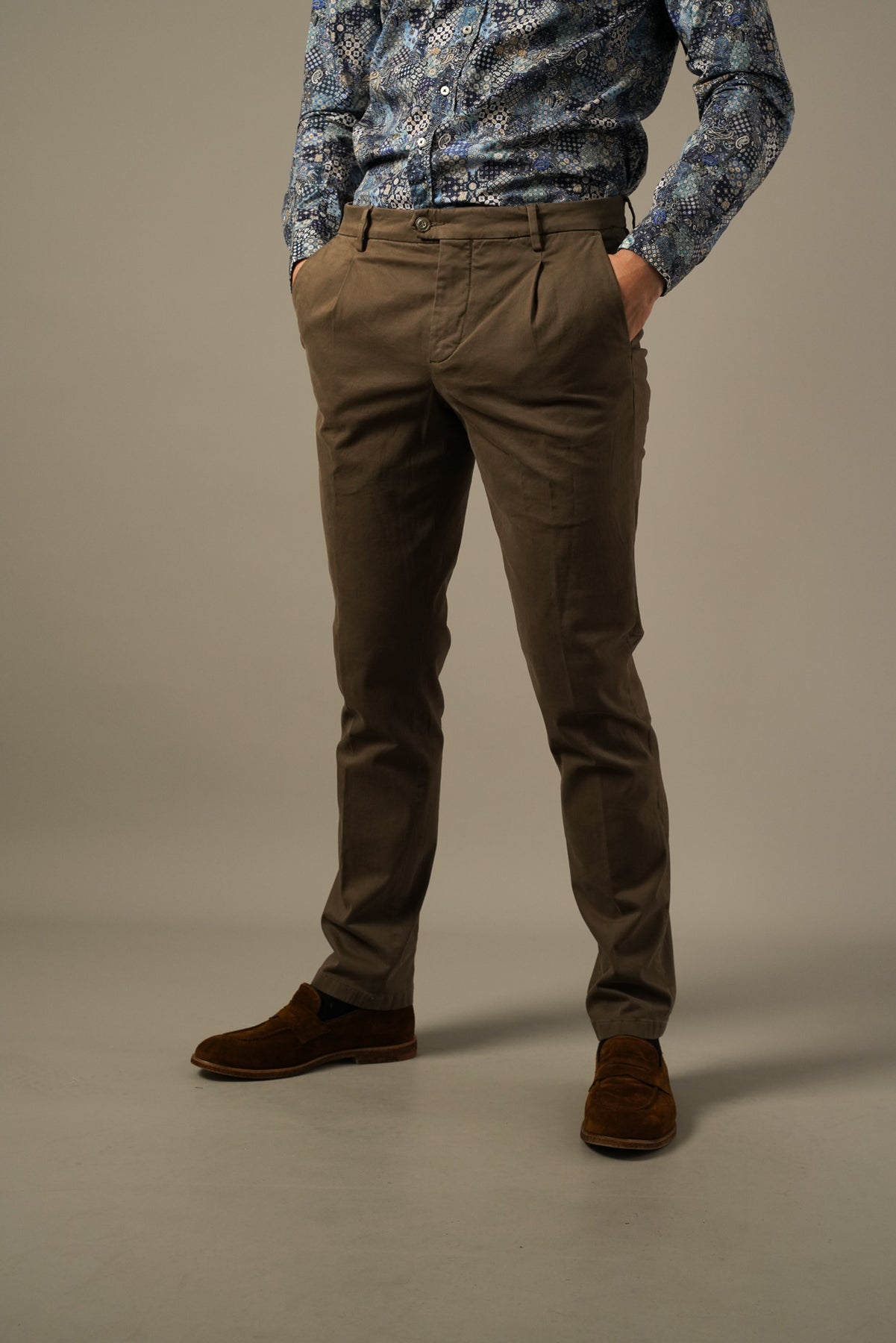 Moderne chinos fra Teleria Zed i en klassisk brun farve. Fremstillet i 98% bomuld og 2% elasthan, hvilket giver både komfort og fleksibilitet til hverdagsbrug og mere formelle lejligheder. Et stilrent valg, der kombinerer italiensk kvalitet med et tidløst design.Fit: Regular Fit