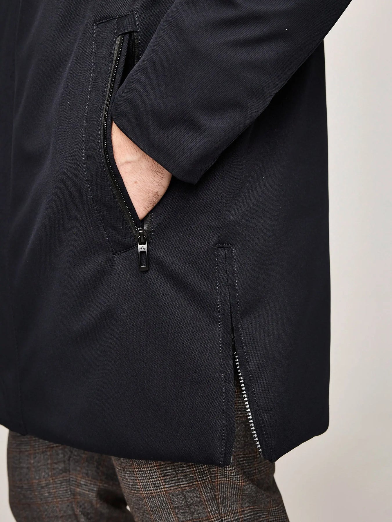 Designet holdes rent og sofistikeret i en dyb navy nuance, der tilfører et klassisk og maskulint udtryk, perfekt til både hverdag og pænere brug. De lynlåslukkede sidelommer med blødt fleecefor giver ekstra komfort, og de to inderlommer sikrer praktisk opbevaring af dine vigtigste ejendele.