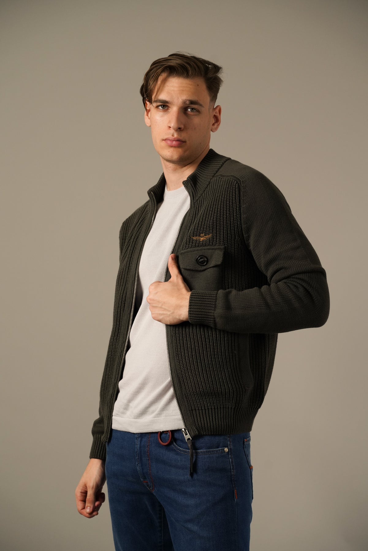 Den har fuld lynlås, brystlomme med knap, og det ikoniske broderede Aeronautica Militare-logo på brystet, som tilføjer et eksklusivt touch.Perfekt til overgangssæsonerne – kan bruges både alene eller under en jakke for et sofistikeret casual look.