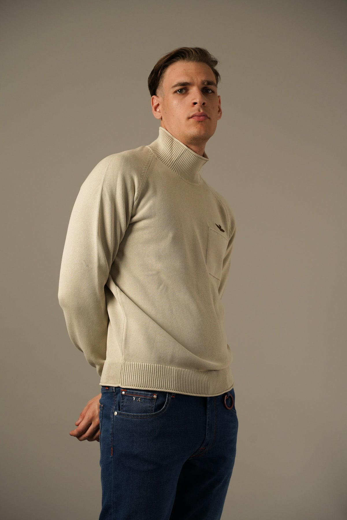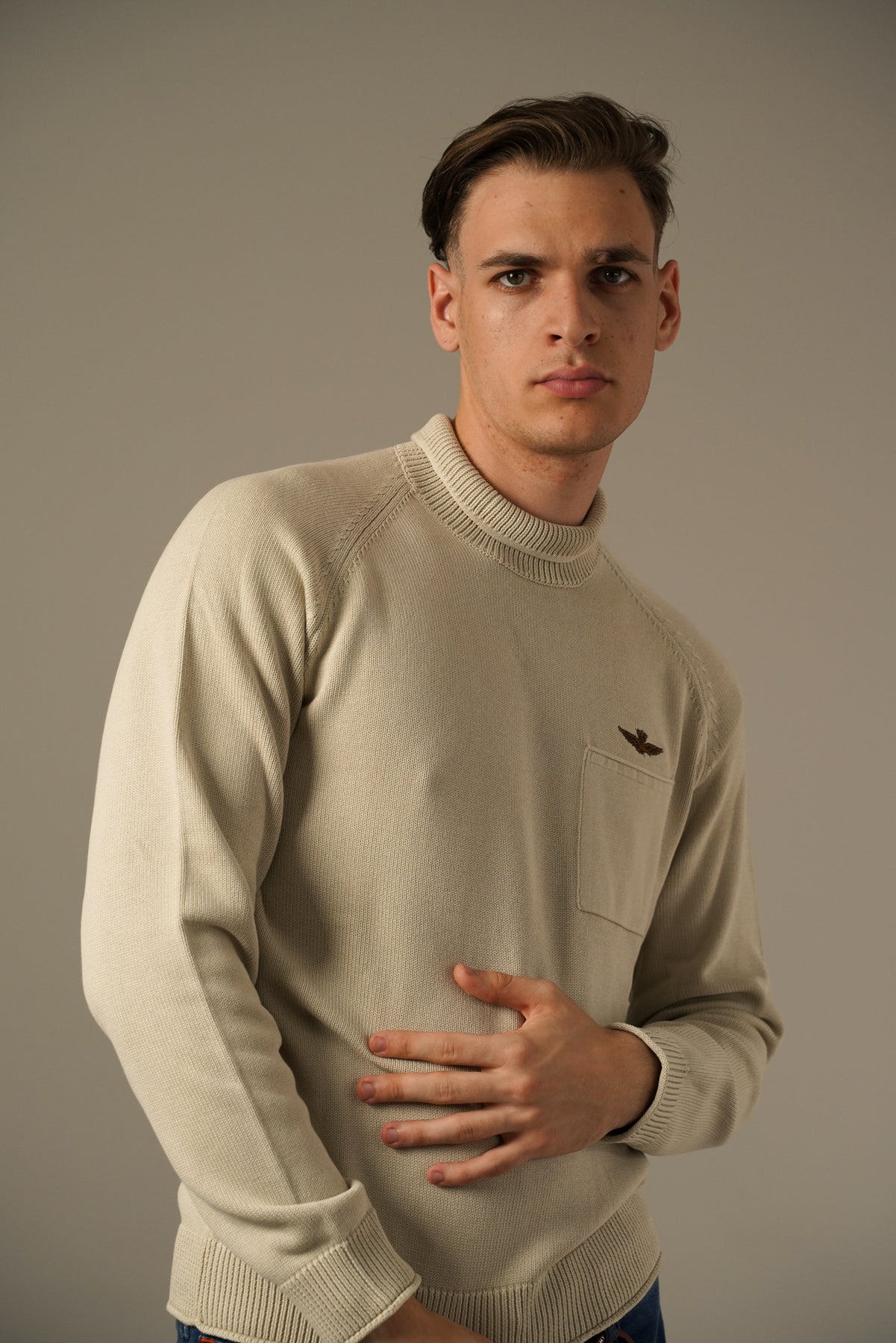 Klassisk og elegant sandfarvet striktrøje fra Aeronautica Militare, designet med høj hals og brystlomme for et moderne og sofistikeret udtryk. Den diskrete logo-detalje på brystet tilfører trøjen et eksklusivt præg, som er kendetegnet for brandet.