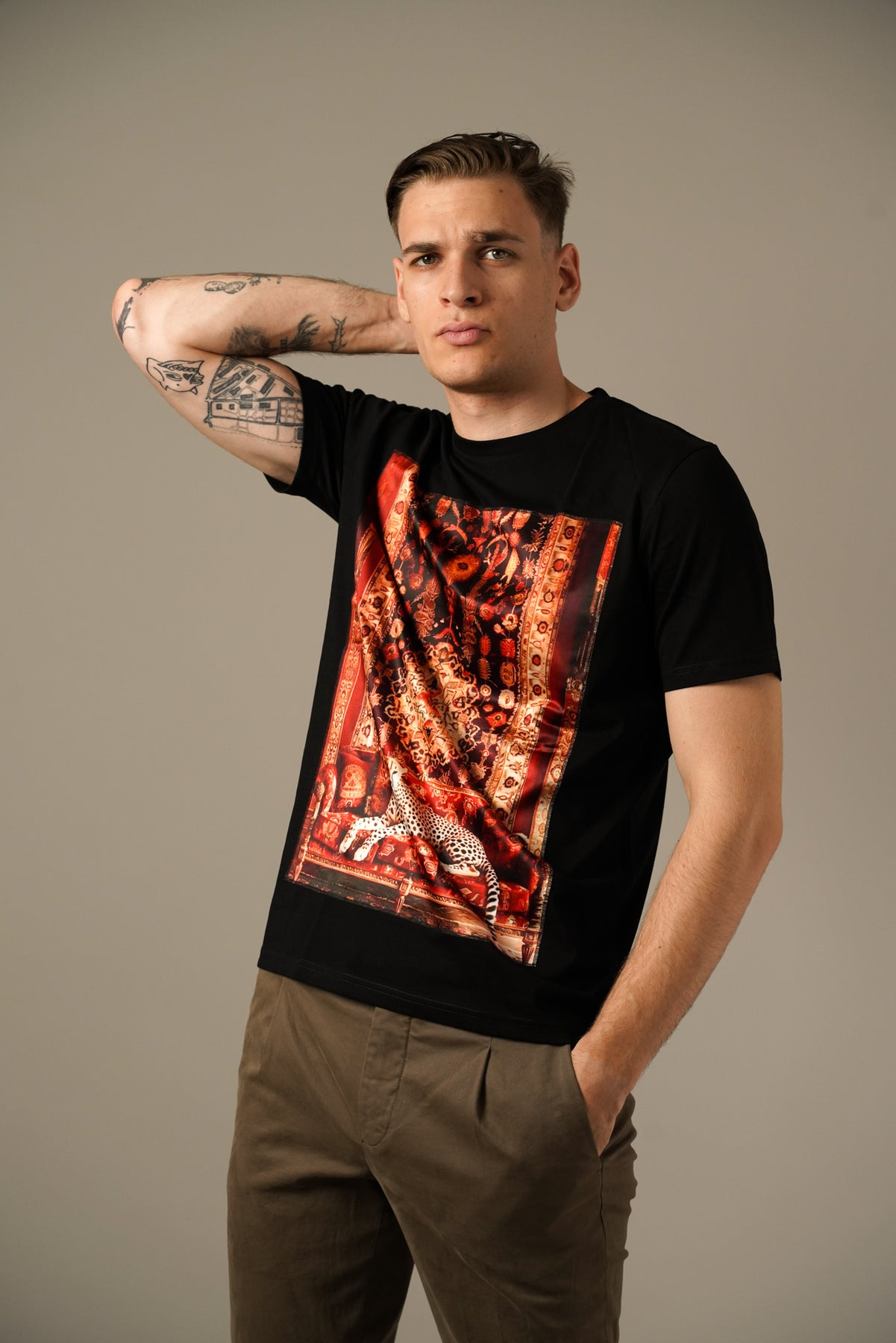 Sort t-shirt fra Bastille med et markant frontprint i røde og orange nuancer, der forestiller et kunstnerisk tæppe-design med leopard-detalje. Den bløde bomuldskvalitet giver høj komfort, mens pasformen er klassisk og nem at style til både jeans og chinos.