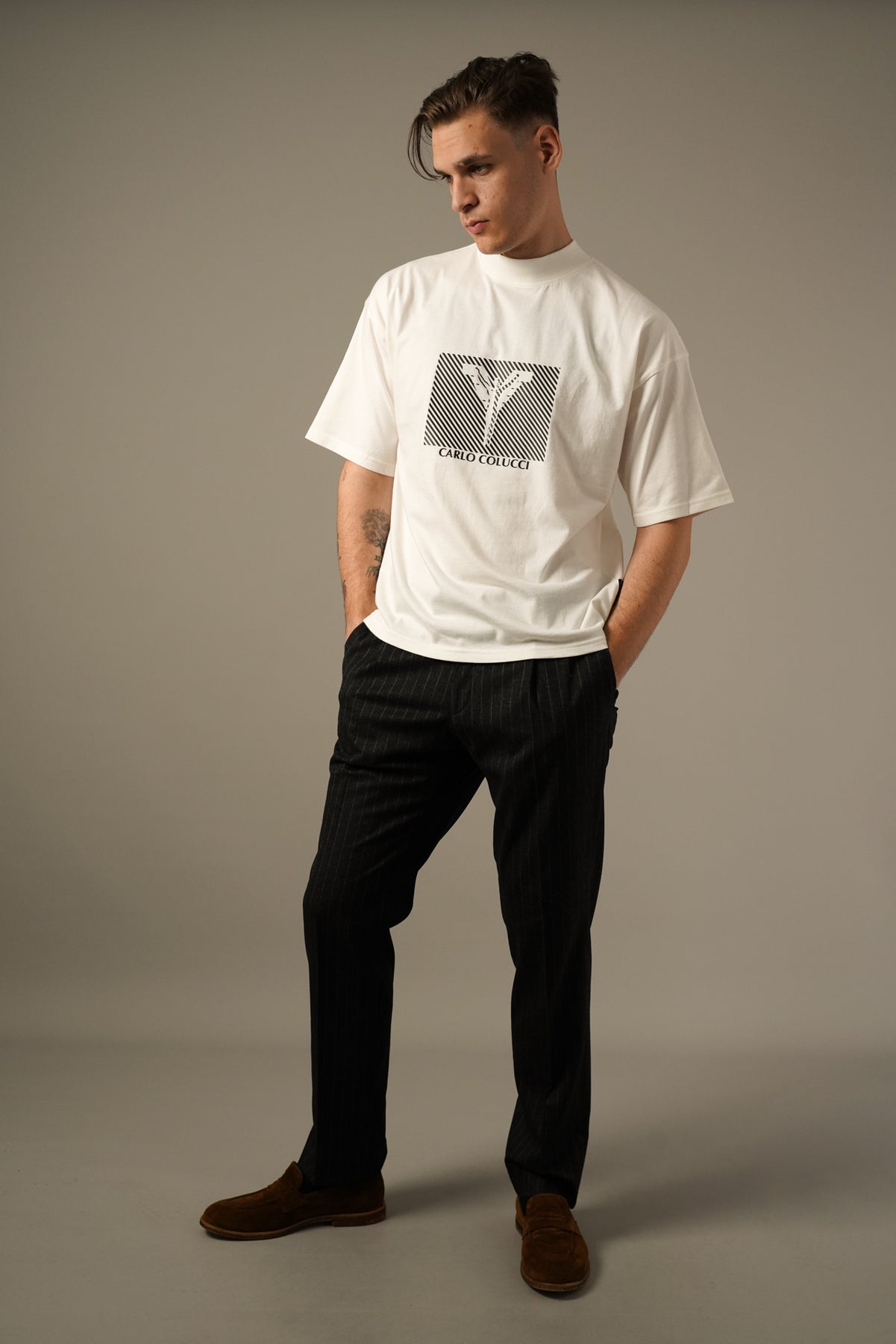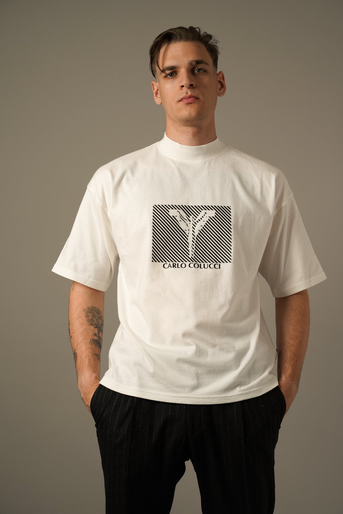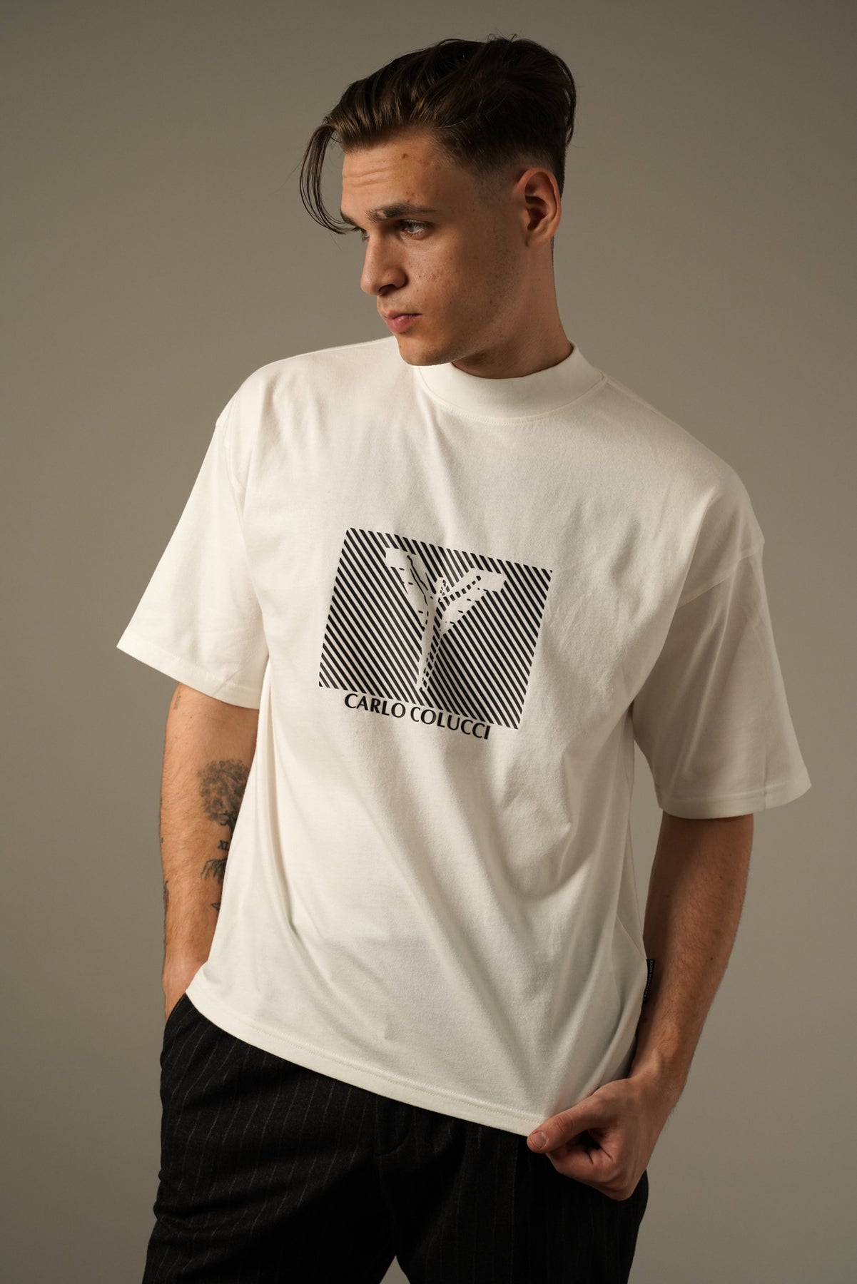 En stilren og komfortabel oversize T-shirt fra Carlo Colucci. Fremstillet i blød bomuld med et moderne, afslappet fit. T-shirten har et markant frontprint med Carlo Colucci-logo, der giver et sporty og urbant udtryk. Perfekt til både casual hverdagsbrug og til at sætte et statement i dit outfit.