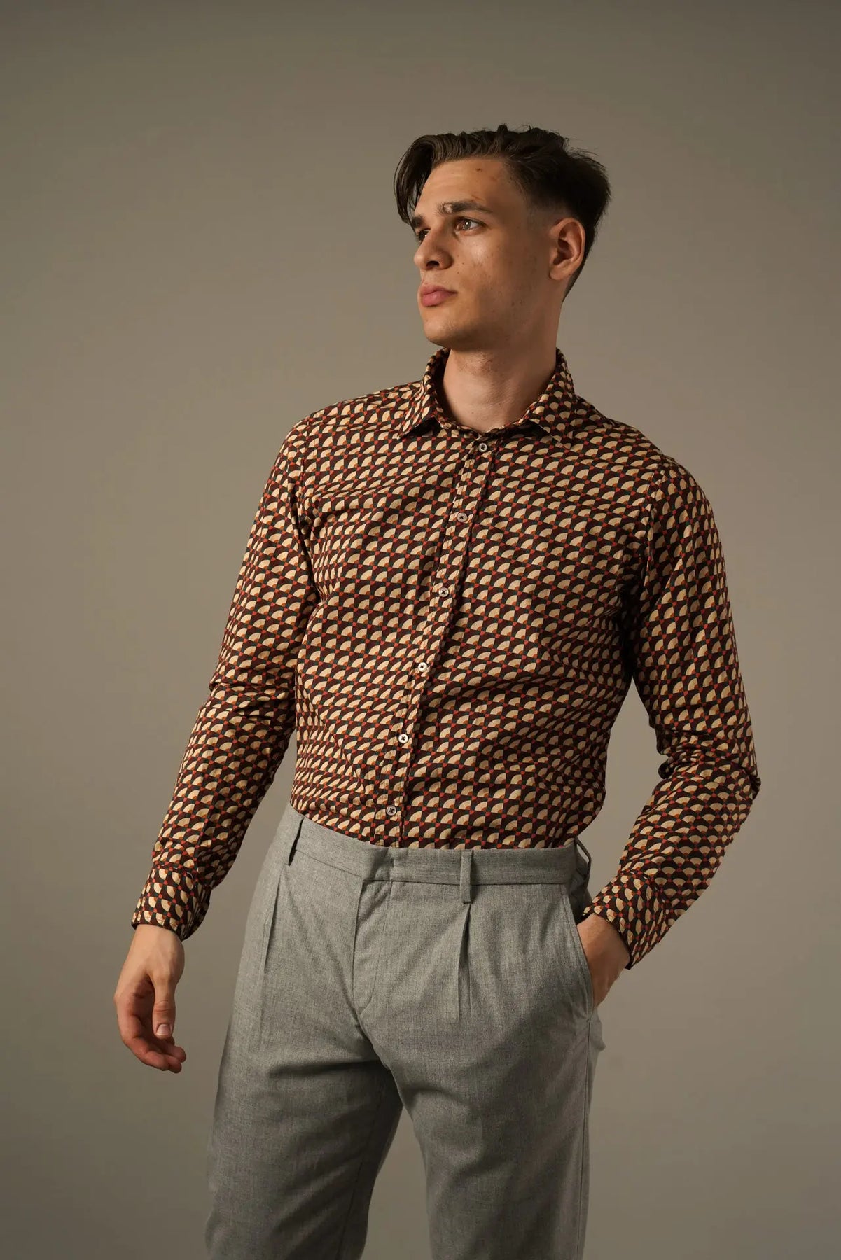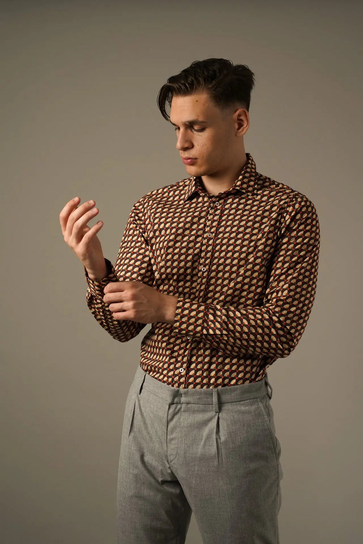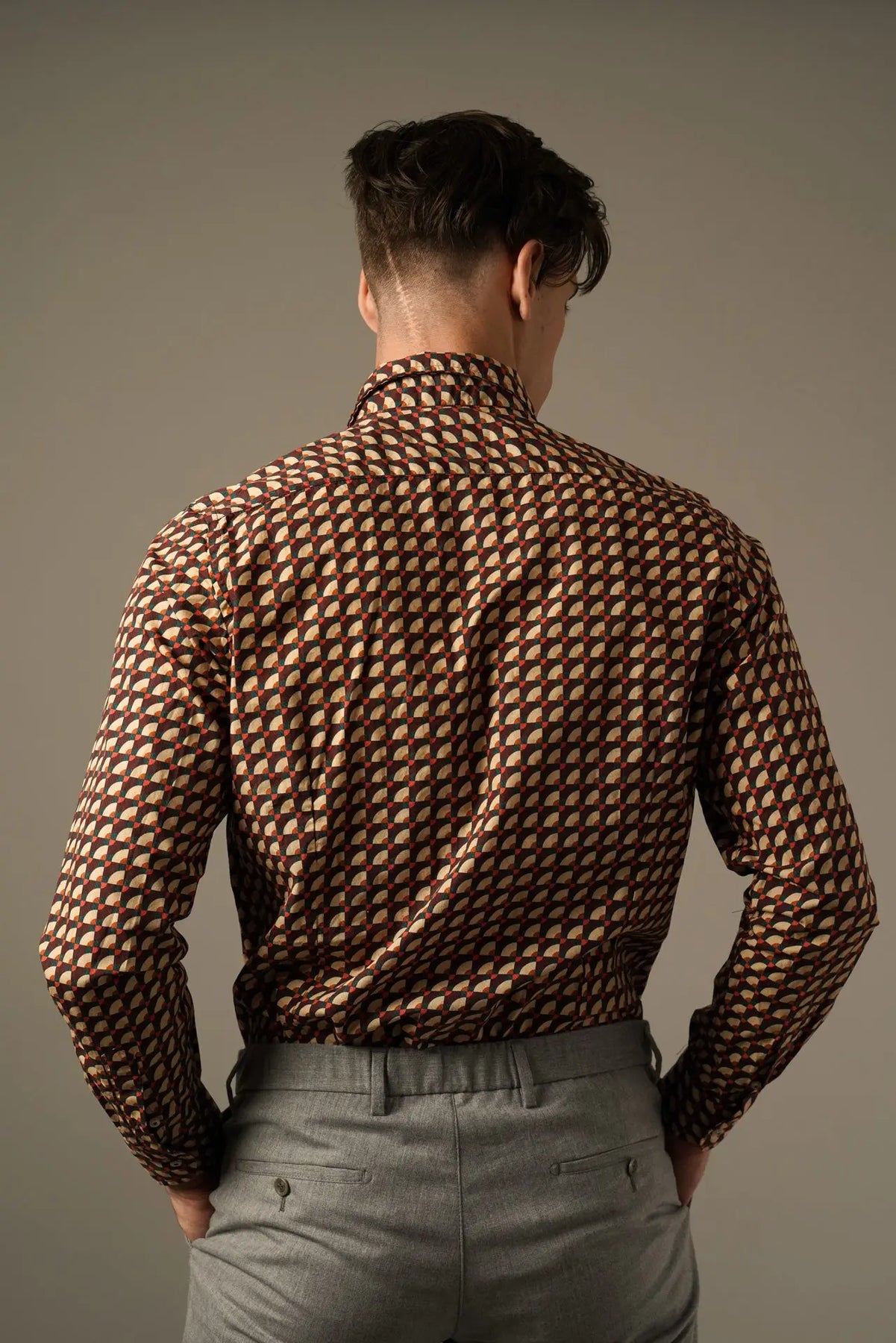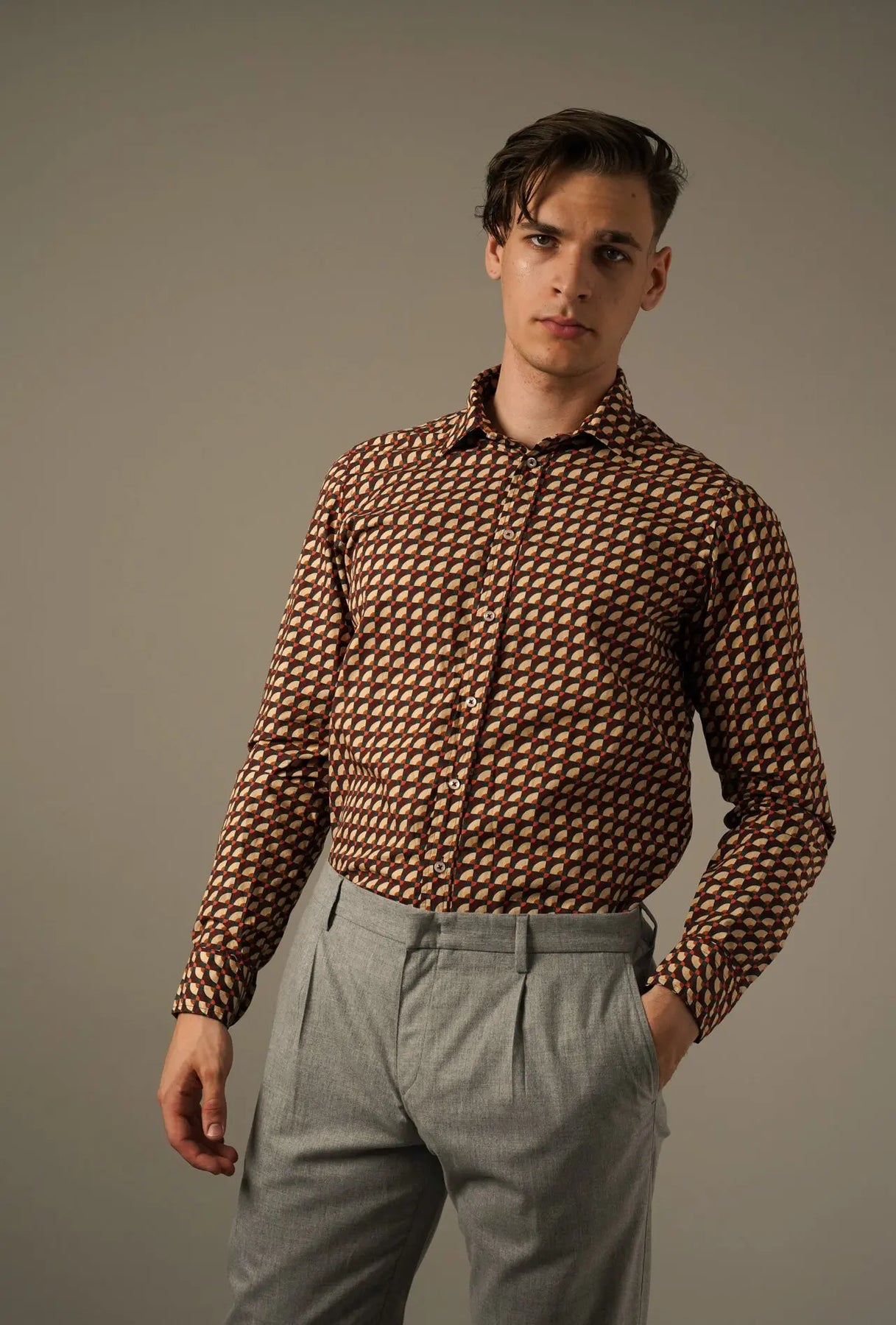 Elegant mønstret skjorte fra Altem Flower i modern fit. Skjorten er fremstillet i 100% bomuld og har et karakteristisk retro-inspireret mønster i brune og beige toner med kontrastdetaljer. Perfekt til dig, der ønsker en skjorte med kant og personlighed.